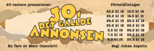 Fredag 20.2 kl. 15. Premiär: AV-teaterns ”Jo, det gällde annonsen”. Regi: Johan Aspelin.