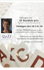 Söndag 18.1 kl. 18: Tävlingen om Dr Bunduls pris i regi av Bokklubben. Kretsarnas frågesport med guldkant jubileumsåret till ära, Stina Ekblad medverkar via skärm. Kom med som publik eller ställ upp i det tvåpersonerslag som representerar din krets. Ingen förhandsanmälan behövs. Välkommen!